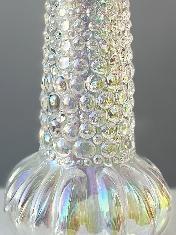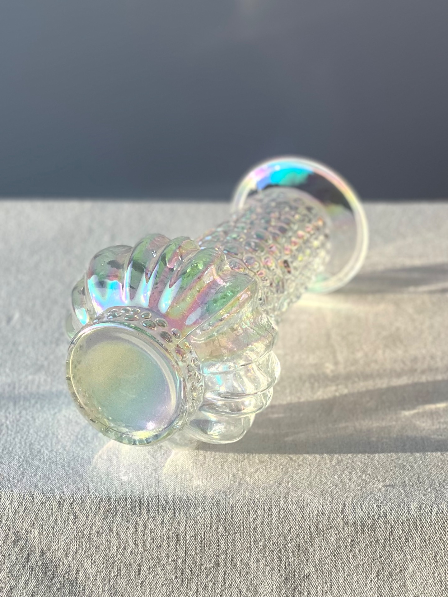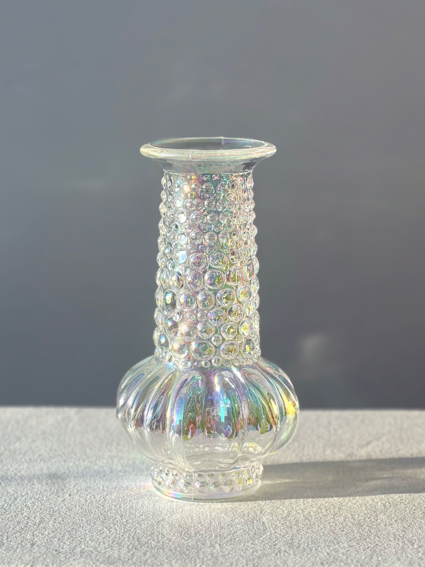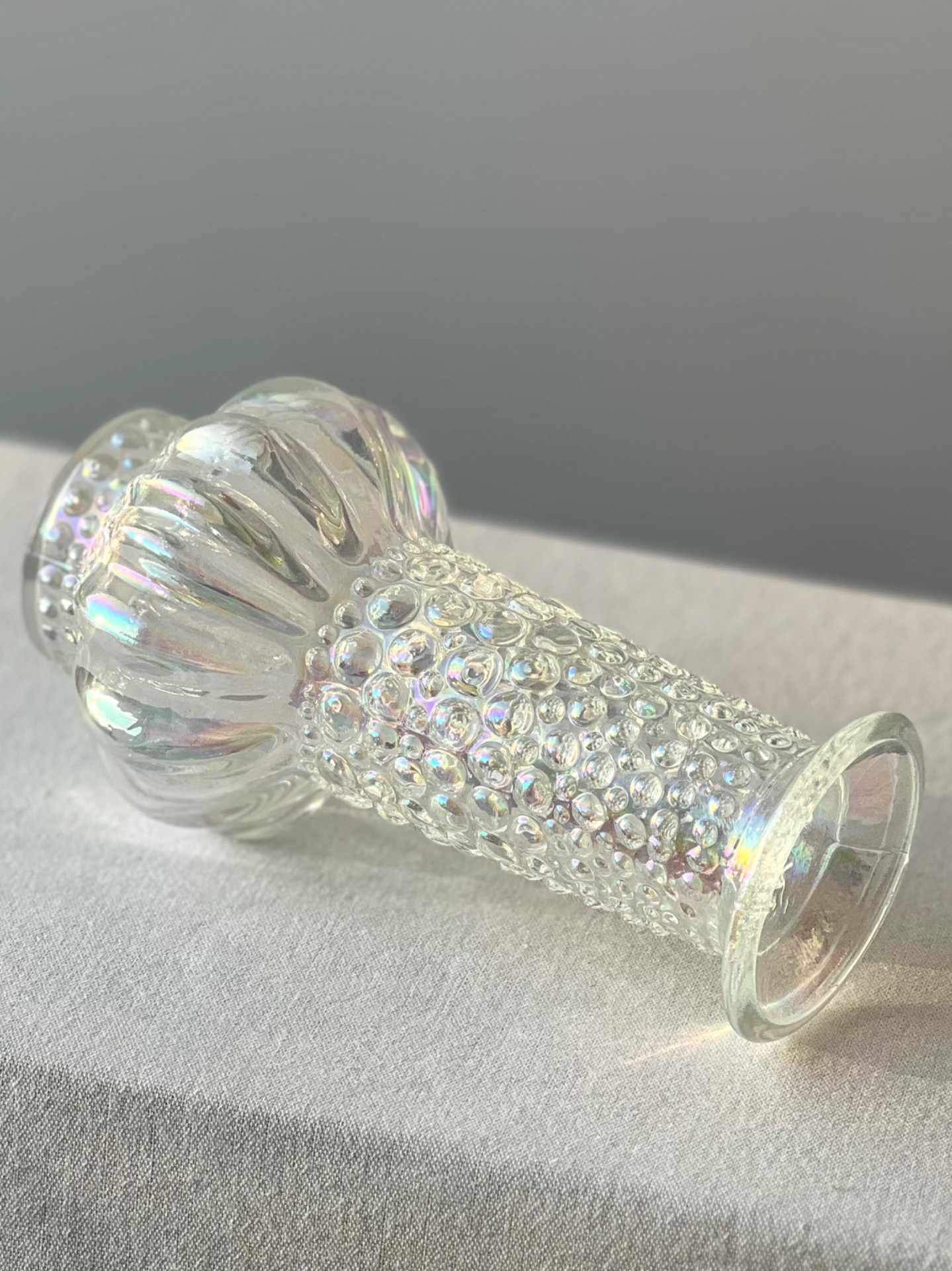 Krásná bublinková váza z lisovaného skla. Navhrl ji Pavel Pánek v 70. letech pro libochovickou sklárnu. Duhový efekt na světle vytváří nádherné odlesky. Skvělý stav, výška 17 cm.