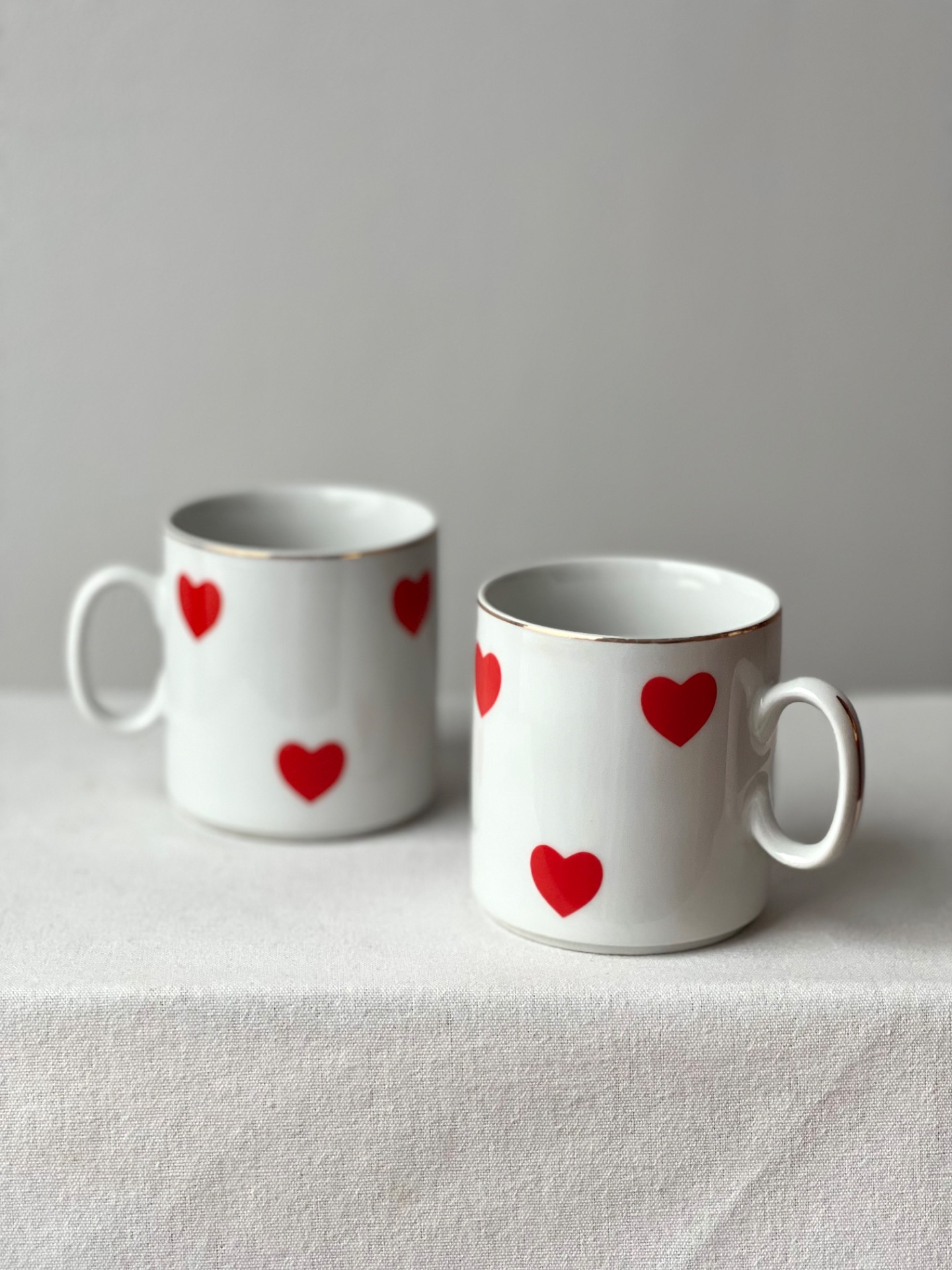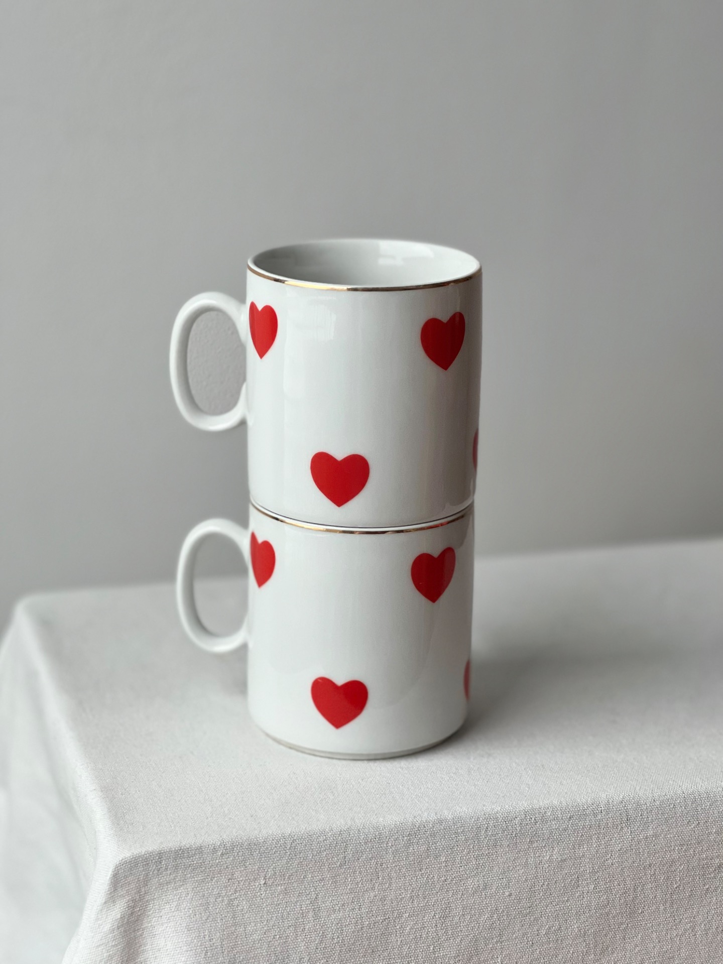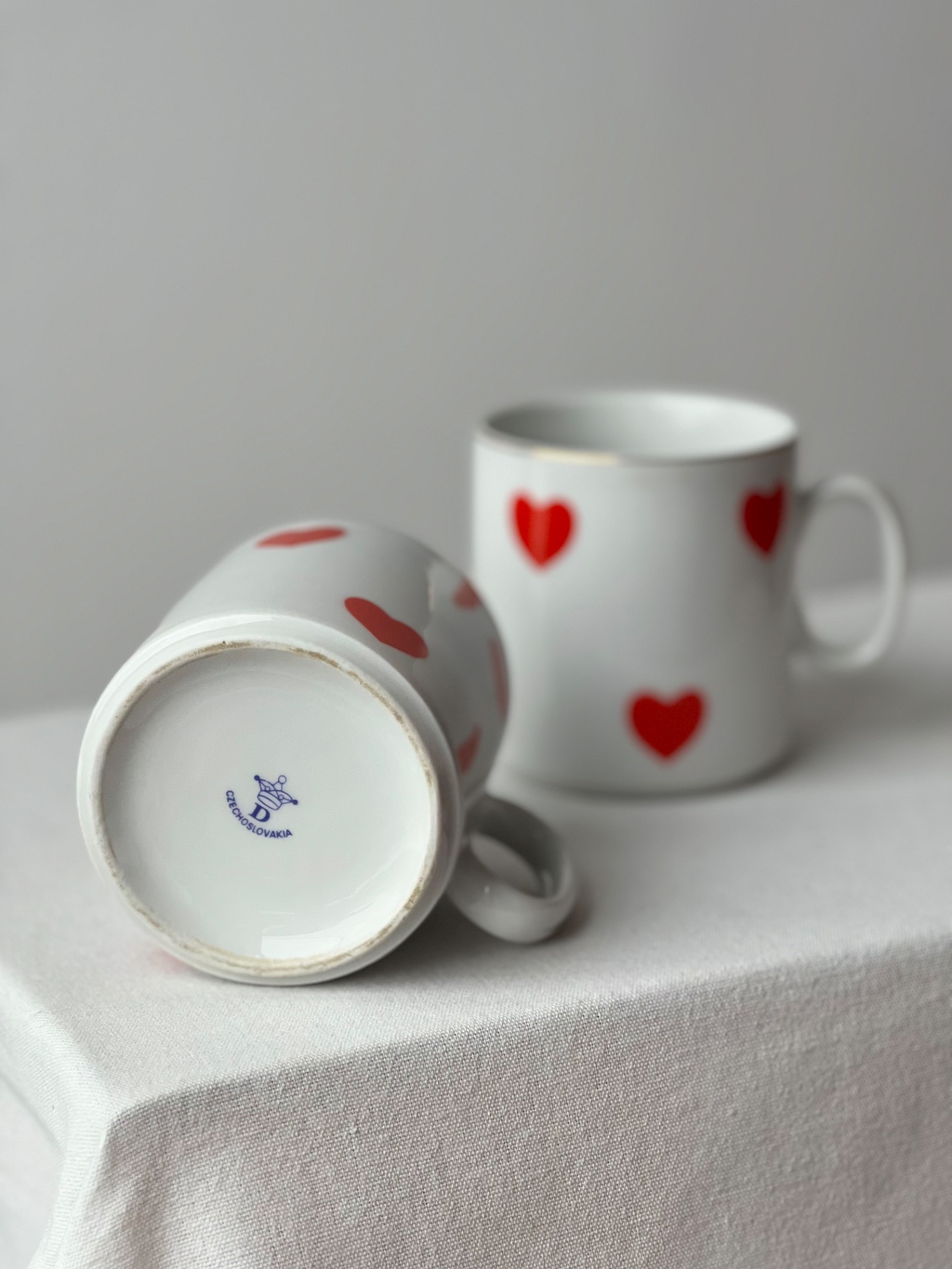 Sběratelské retro hrnečky s roztomilým srdíčkovým dekorem patří k tomu nejmilejšímu, co vznikalo v bývalém Československu. Mají krásný čistý tvar, sytě červená srdíčka a jemnou zlatou linku, díky které působí elegantně, ale pořád hravě.