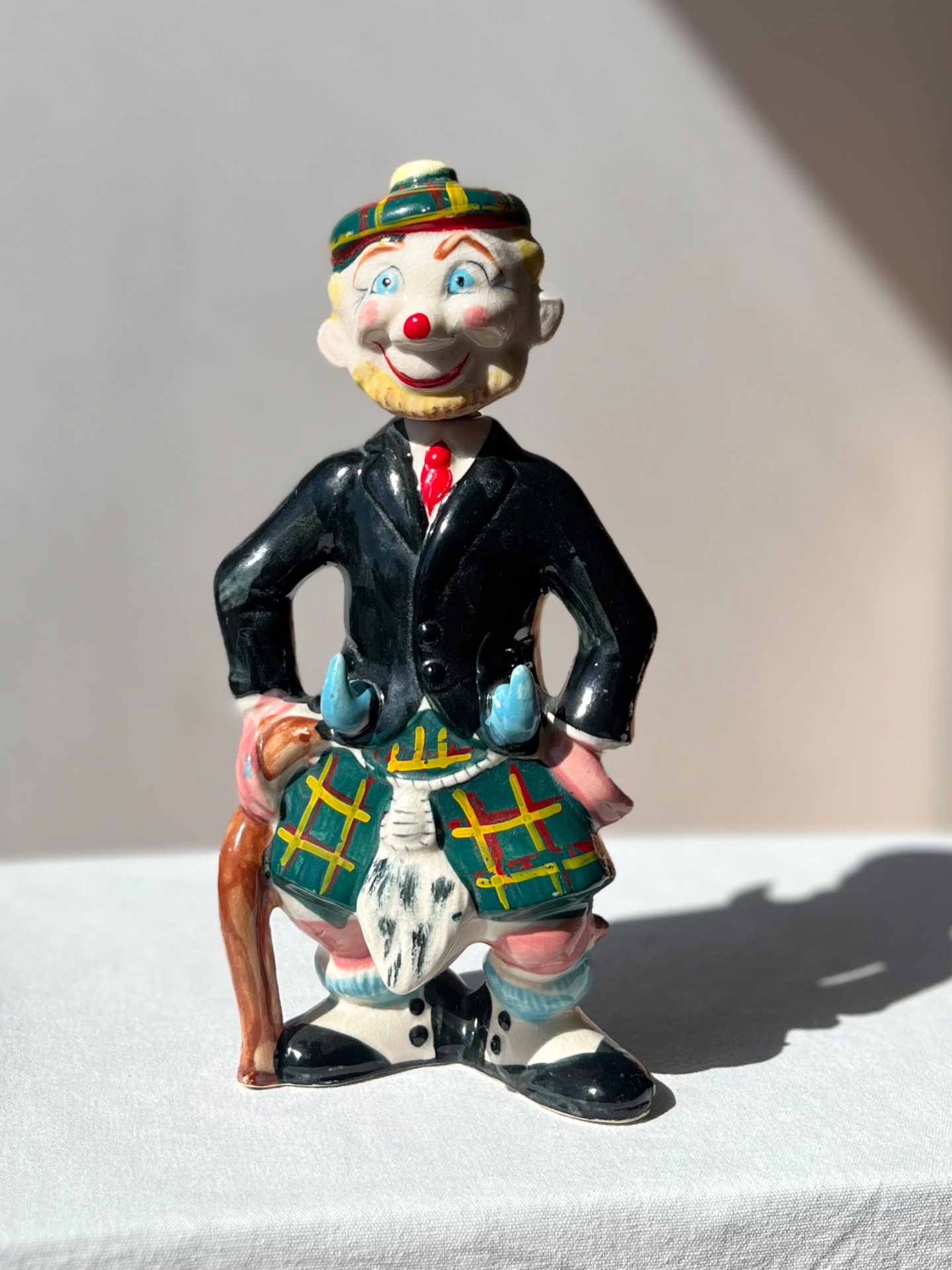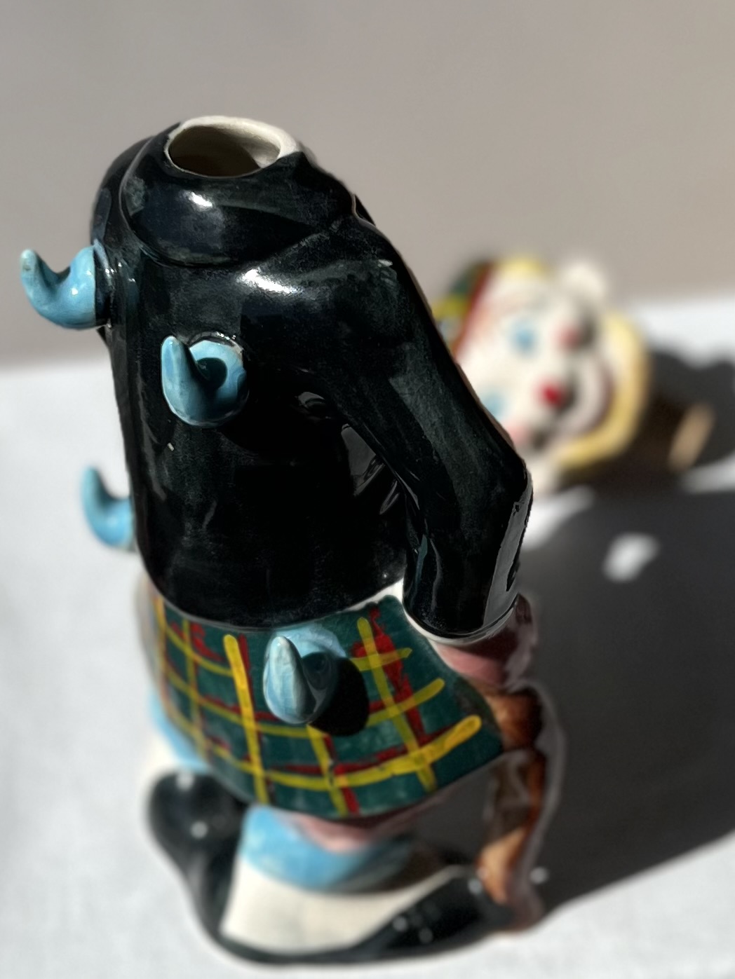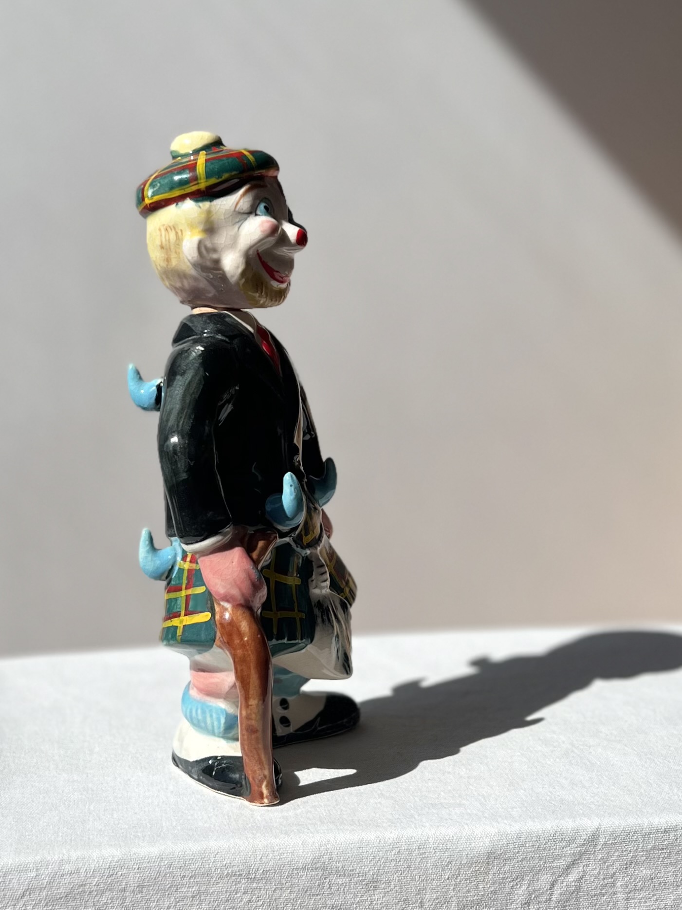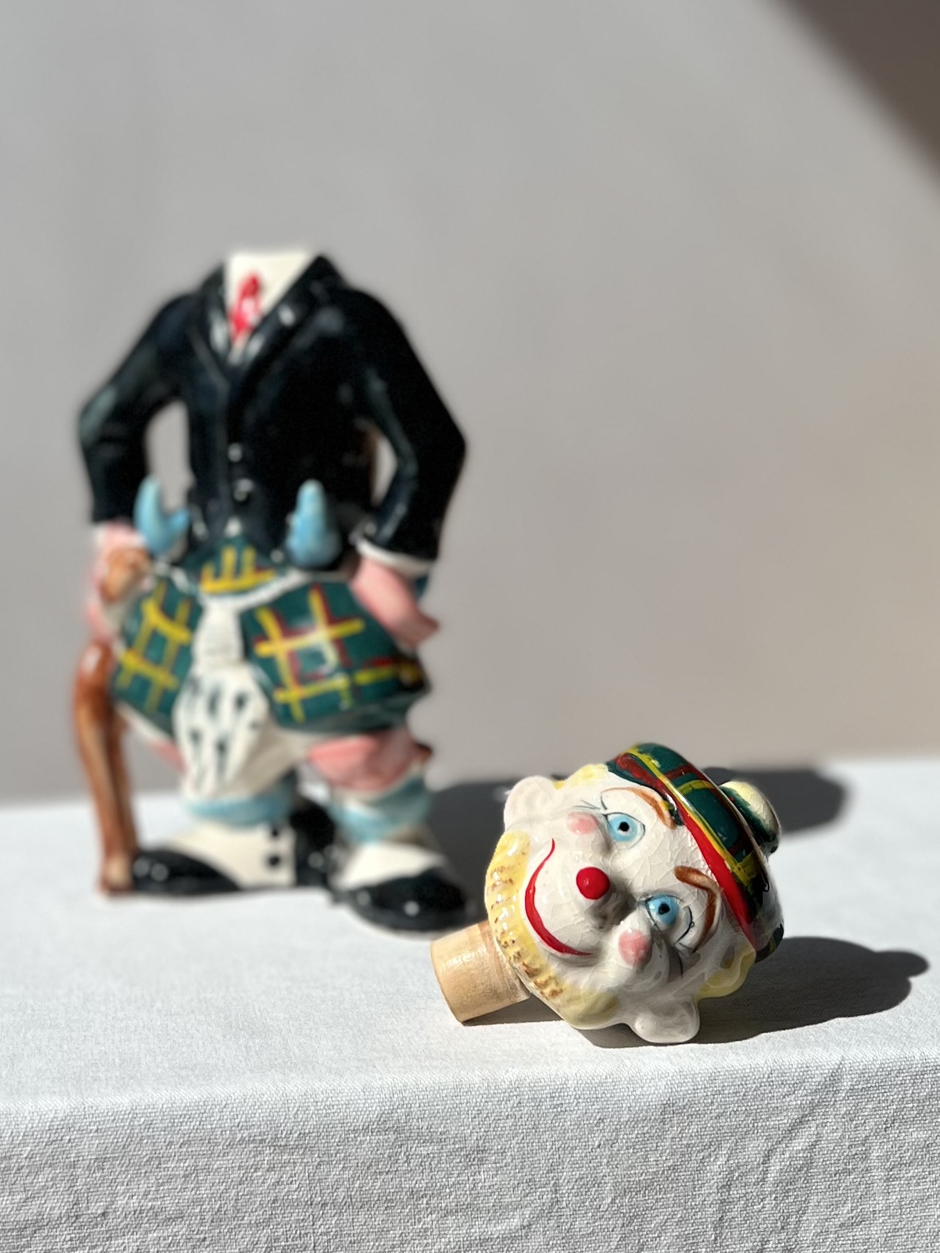 Vintage láhev ve tvaru Skota s odnímatelnou hlavou, ručně malovaná zářivými barvami, plná detailů a lehkého šílenství.