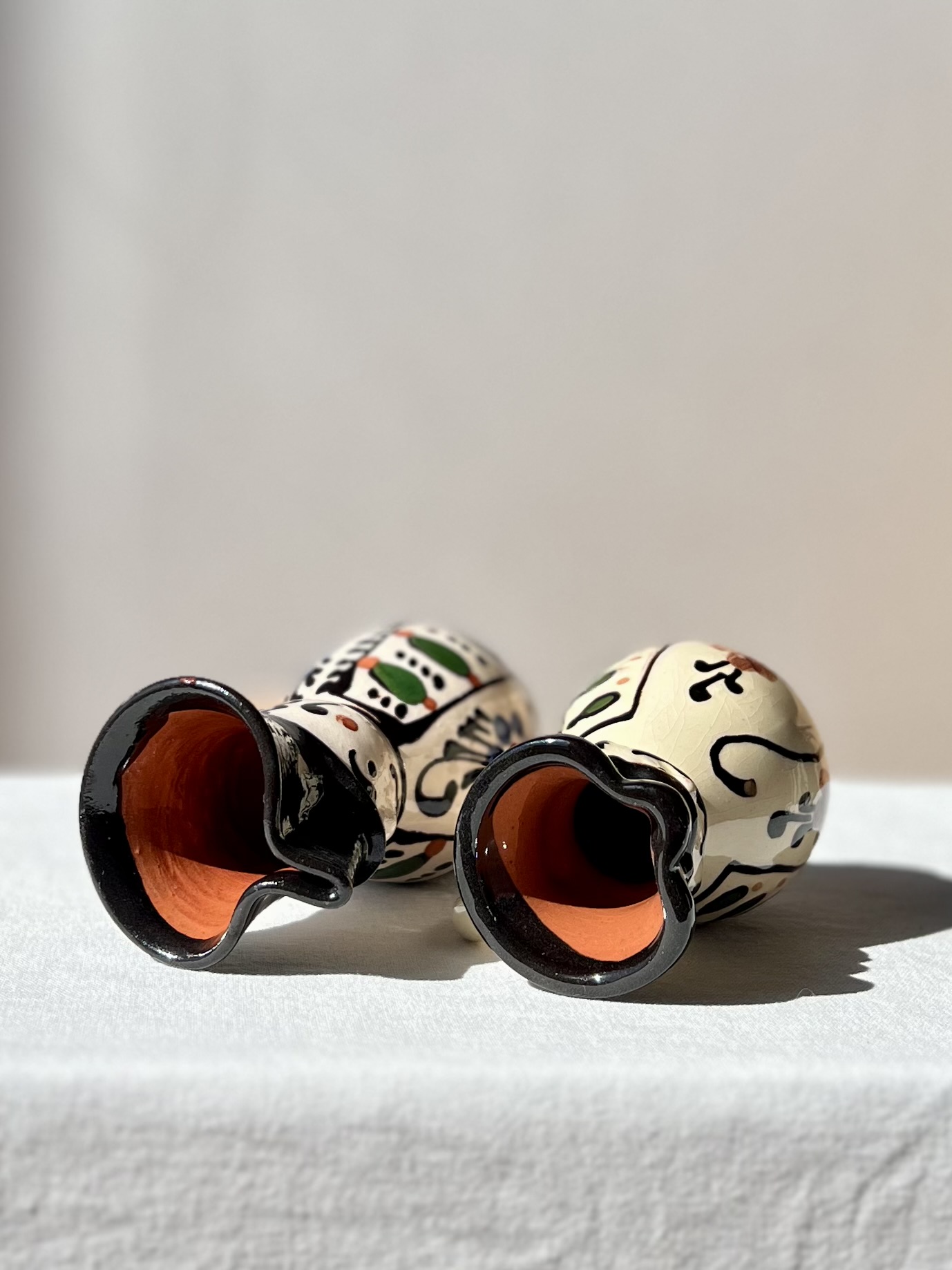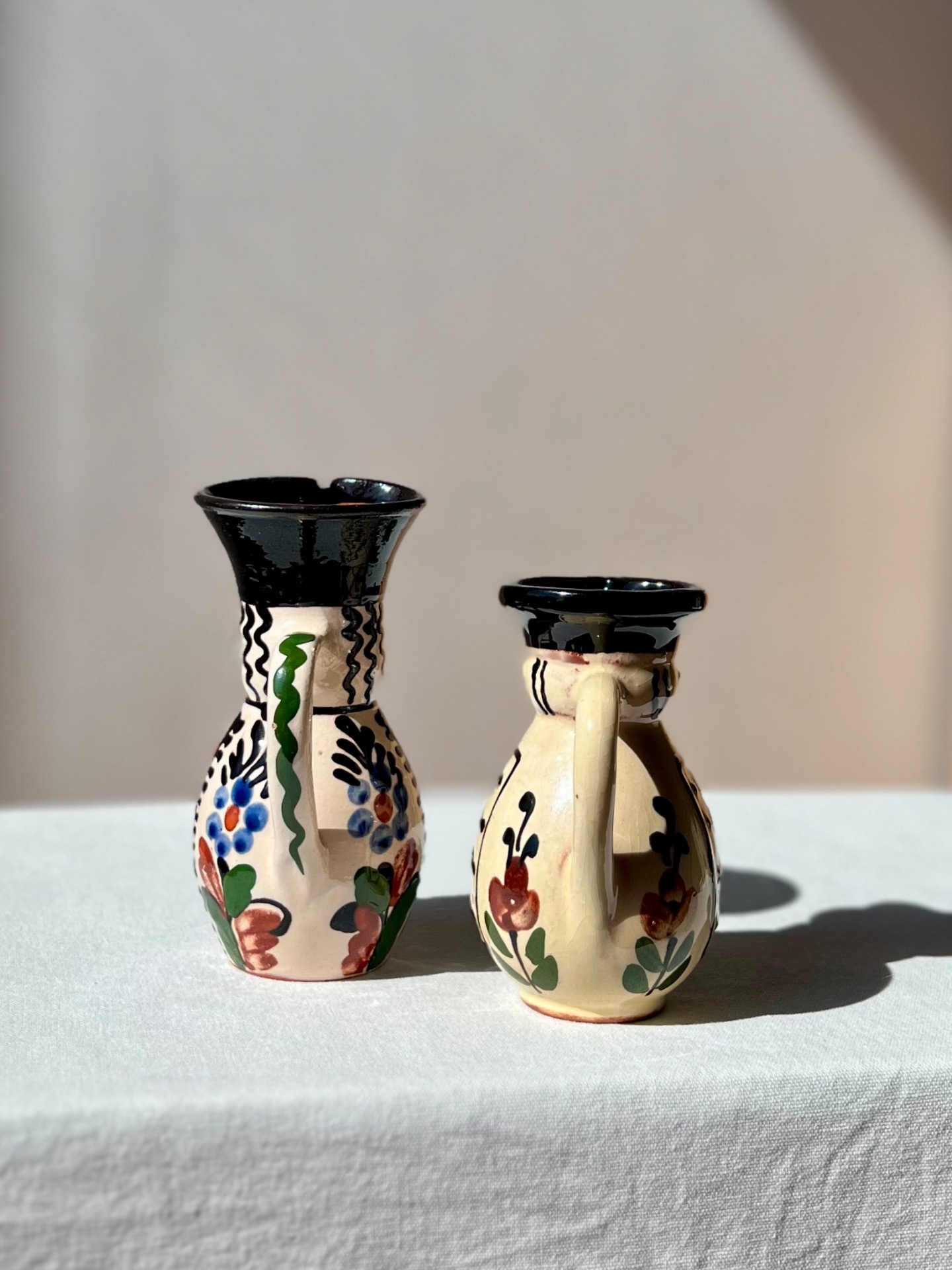 Vyroben z červené hlíny a zdoben glazurou s ručně malovanými lidovými motivy. Na těle džbánku se objevují typické ornamenty, které vycházejí z folklórních vzorů a symboliky.