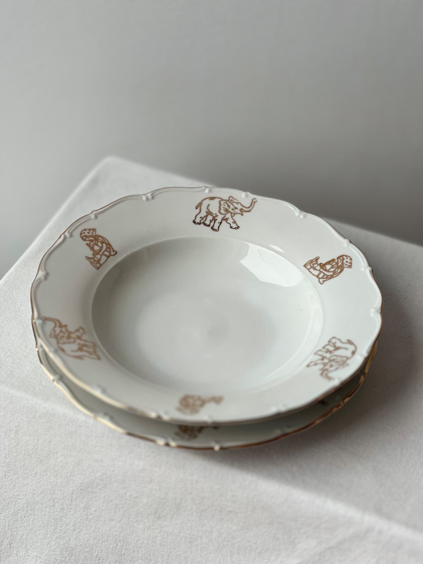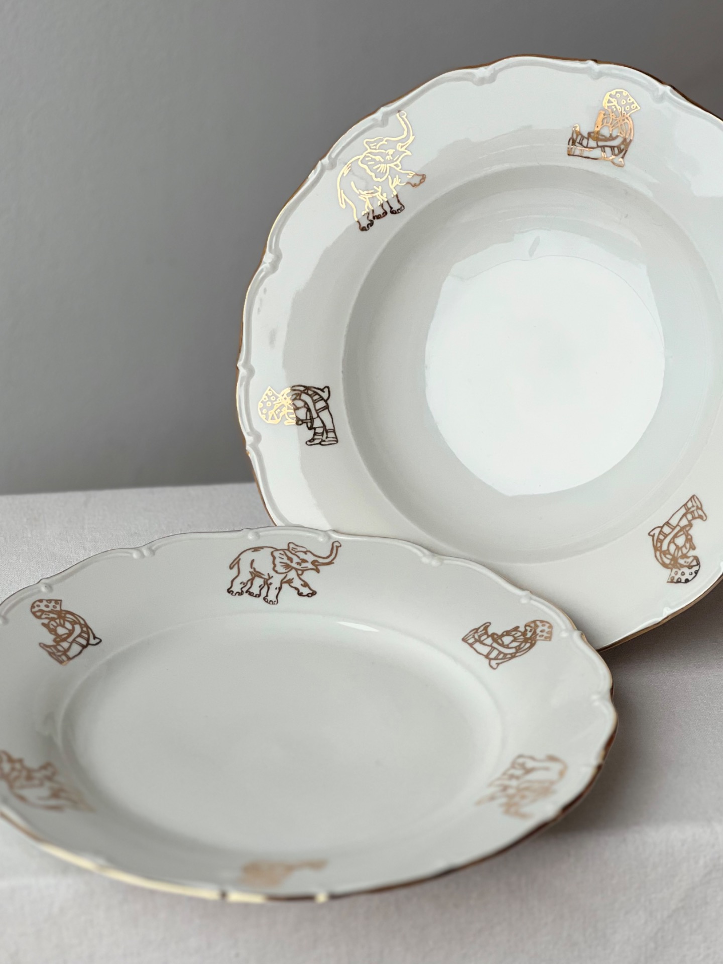 Kouzelná dětská sada porcelánových talířů, která jako by vypadla z pohádky. Na okraji se objevuje zlatý slon a malá holčička v puntíkatém šátečku. Talíře mají jemně zvlněný okraj, krásně zachovaný zlatý dekor a působí neuvěřitelně něžně.