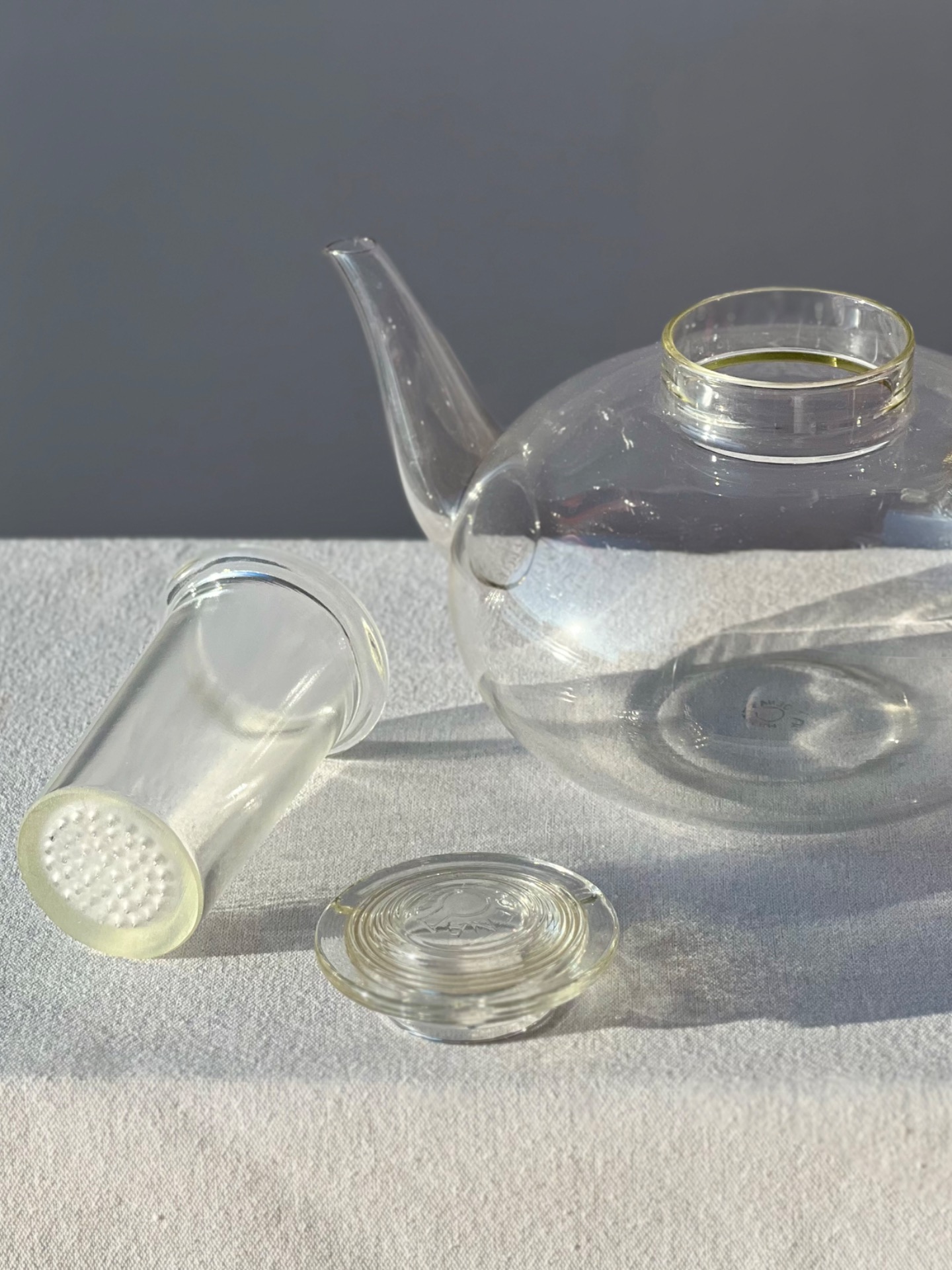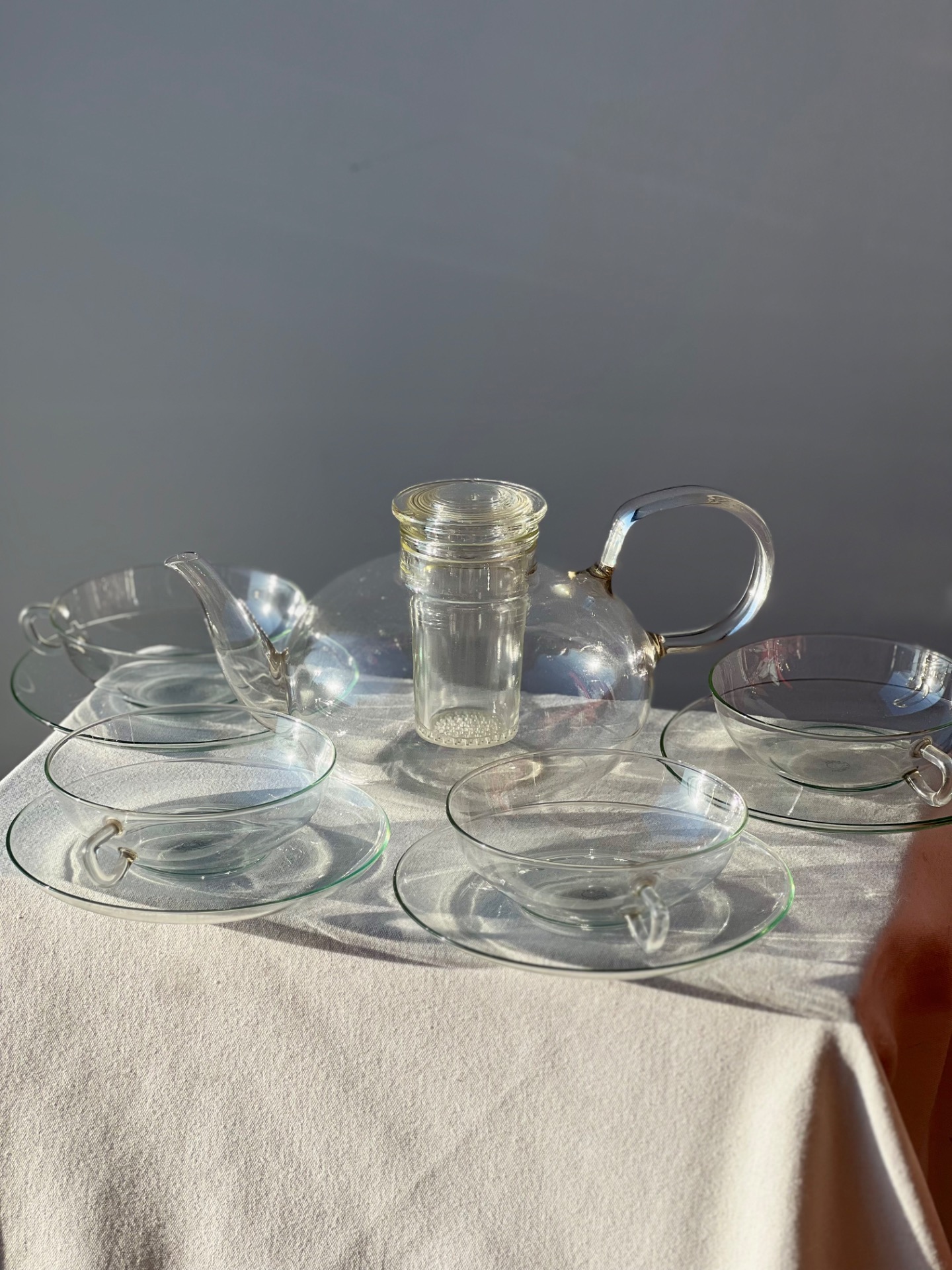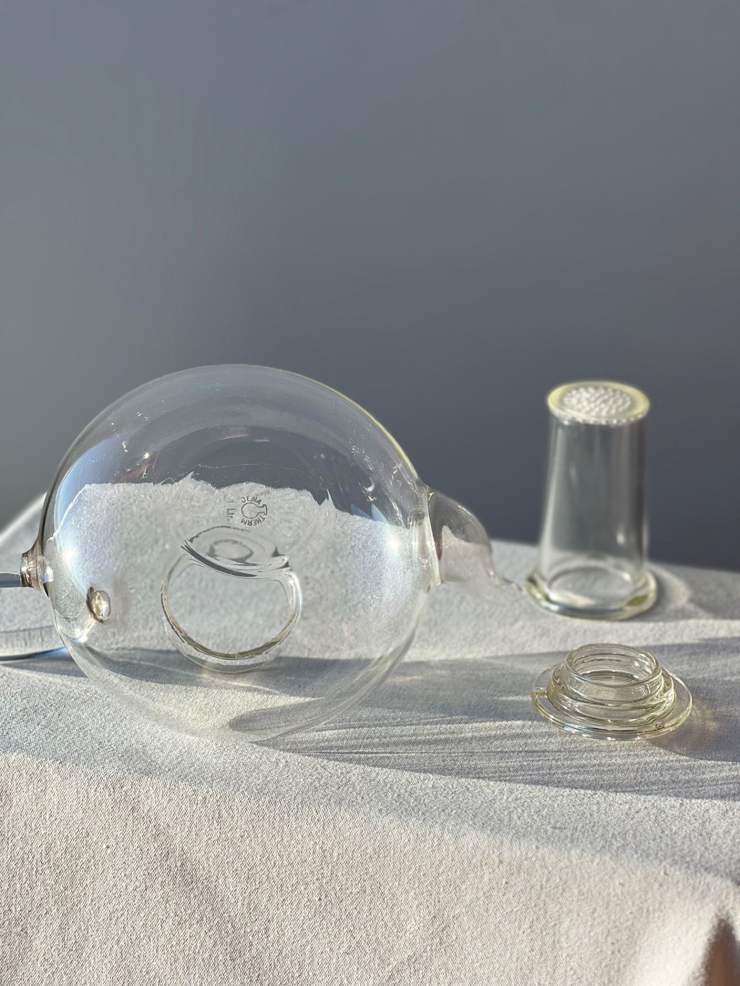Funkcionalistický čajový servis vyrobený podle návrhu německého bauhausového designéra Wilhelma Wagenfelda. Wagenfeld po uzavření Bauhausu ve Výmaru působil na volné noze ve sklárně v Jeně, kde navrhl právě tento ikonický servis ze žáruvzdorného skla.