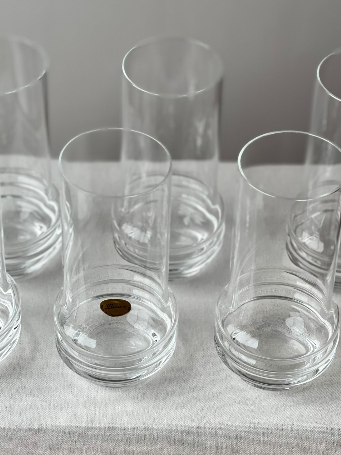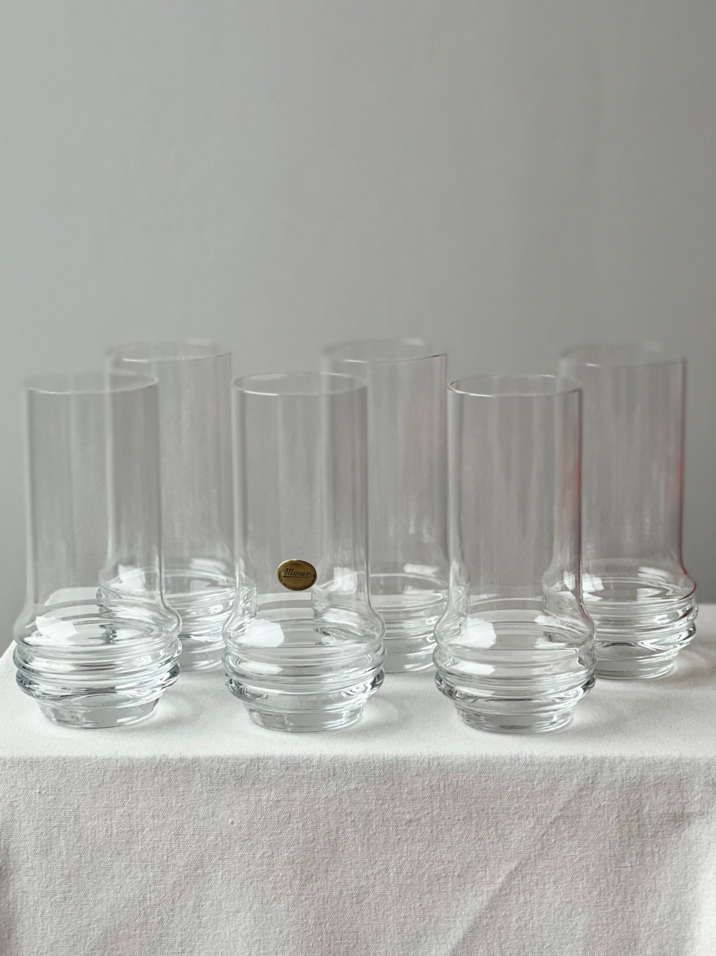 Luxusní sada šesti sklenic navržených designérem Brunem Morbelli pro Moser kolem roku 1970.Nadčasová čirá linie v kombinaci s výrazným plastickým spodkem vytváří elegantní, téměř sochařský tvar. Jedna sklenice má stále původní nálepku Moser, made in Czechoslovakia.