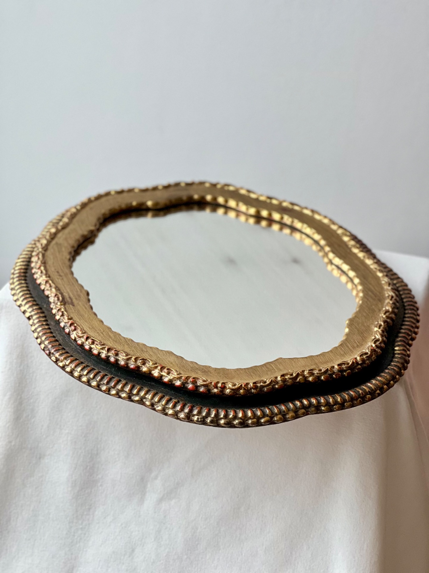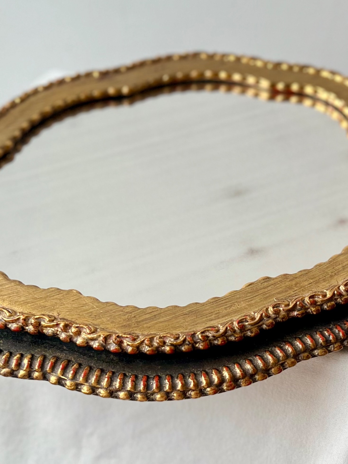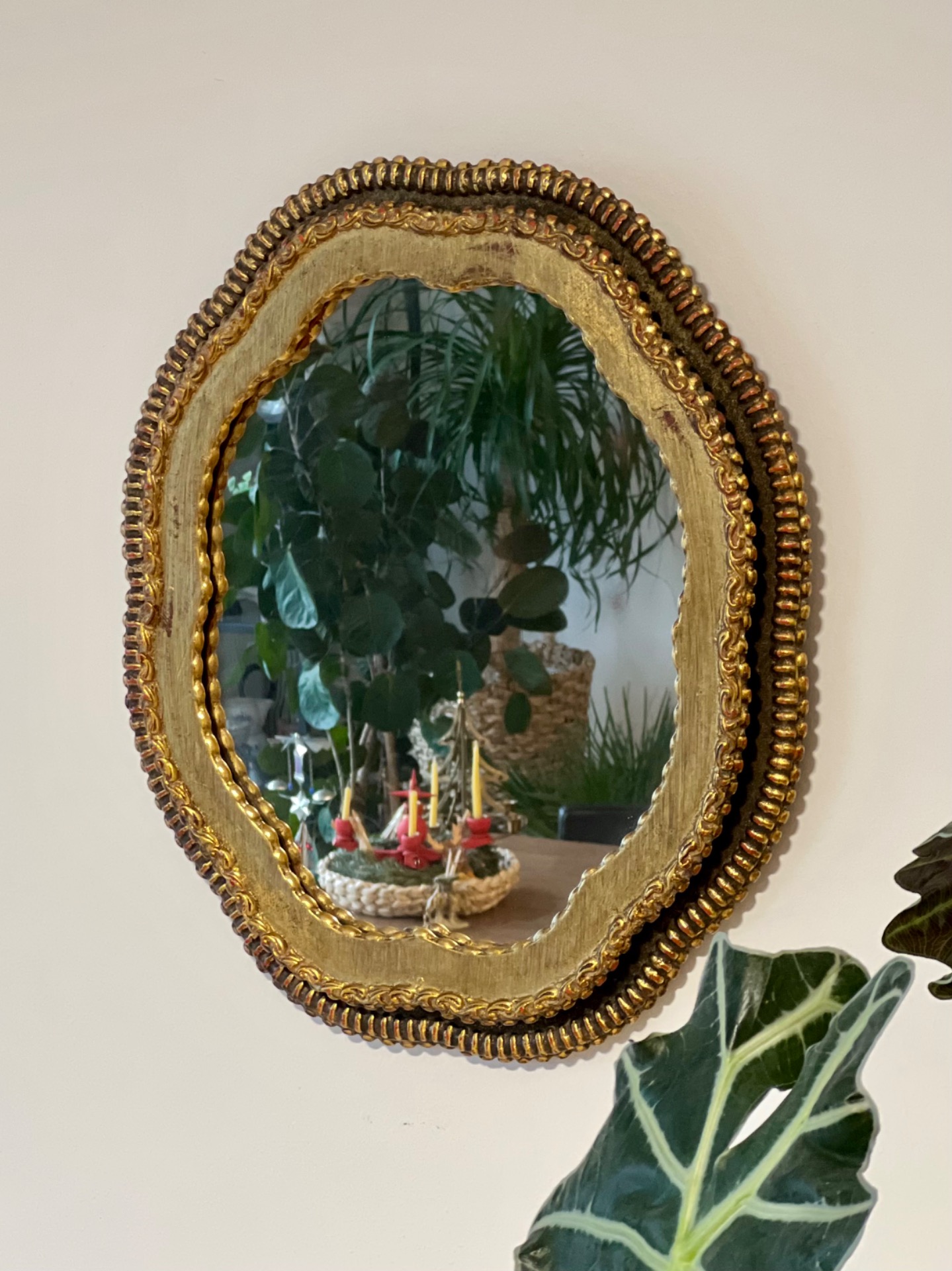 Samotné zrcadlo má drobné tmavší body typické pro starší kusy. Je na tom něco romantického - právě tyto drobnosti mu dodávají jedinečnou krásu a atmosféru, kterou nové předměty jednoduše nemají.