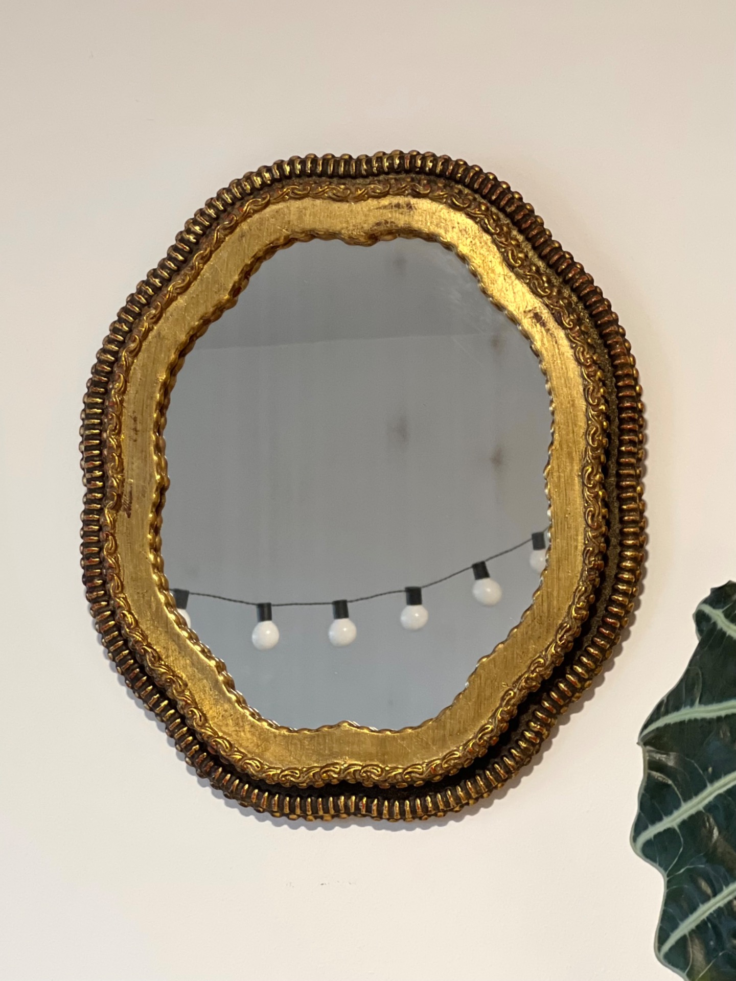 Starožitné zrcadlo v bohatě vyřezávaném a zlaceném dřevěném rámu. Elegantní oválný tvar a výrazná plastika rámu dělají z tohoto zrcadla krásný solitér, který prostoru dodá hloubku, světlo i nádech starých časů. Zlacený rám s jemnou patinou nese stopy stáří, které mu dodávají charakter a autenticitu.